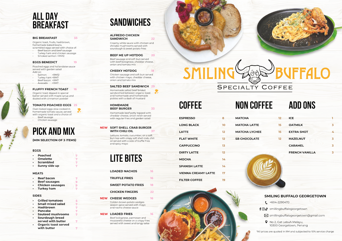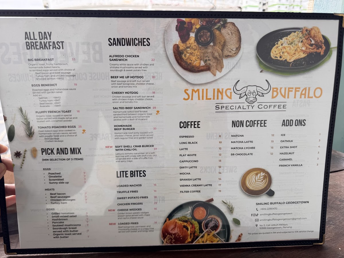 The menu at Smiling Buffalo Georgetown features a variety of options suited for different times of the day, including all-day breakfast items, light meals, and snacks. The offerings include a selection of coffee and tea beverages, as well as desserts, providing options for both quick coffee breaks and casual dining experiences.