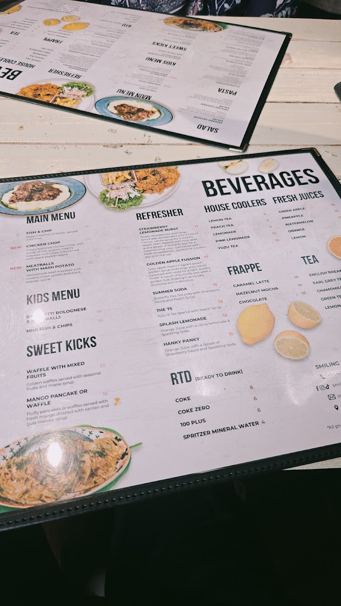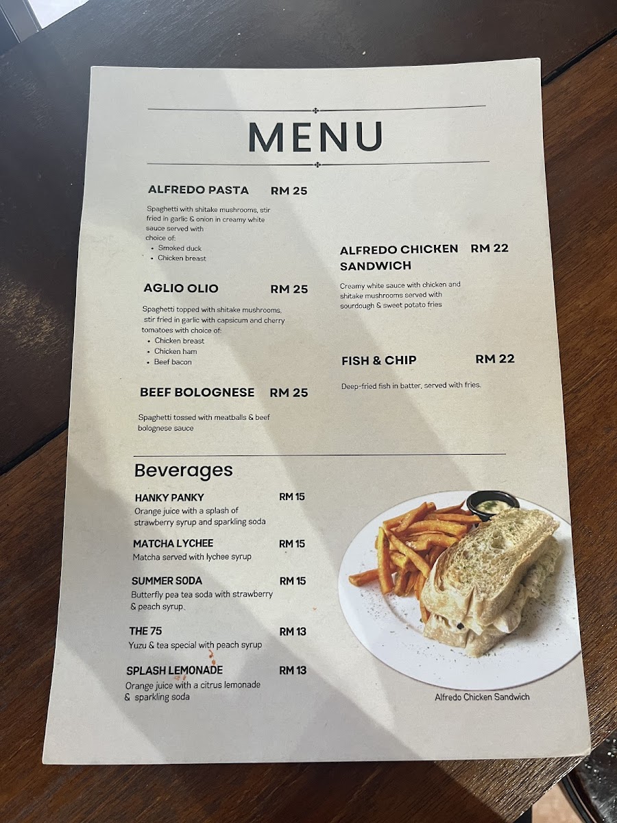 Food selections focus on light meals such as sandwiches and pasta dishes, with customers highlighting items like the Salted Beef Sandwich and Salmon Aglio Olio. The menu also includes classic cafe staples like fish and chips and homemade-style burgers.